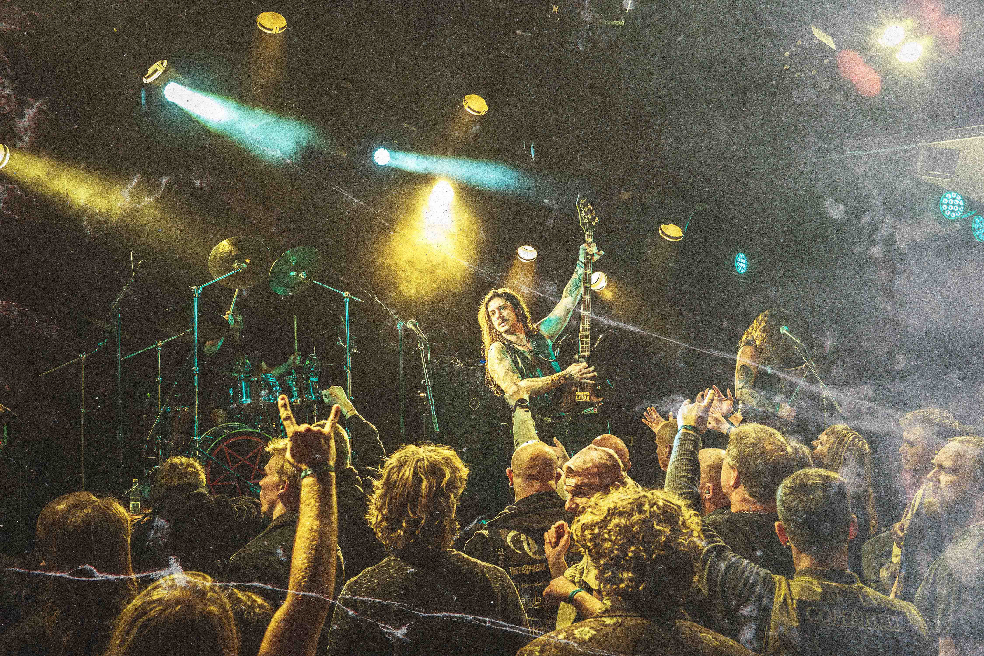 Allerede få minutter inde i sættet stod det klart: nu blev der ikke holdt igen. De første stagedives begyndte, moshpittet åbnede sig for alvor, og gulvet foran scenen forvandlede sig til en kogende masse af kroppe, sved og grin. Det var ikke aggressivt på den lukkede måde – det var festligt, inkluderende og drevet af ren begejstring. Schizophrenia var tydeligvis klar på at feste med Randers, og Randers var mere end klar på at tage imod.