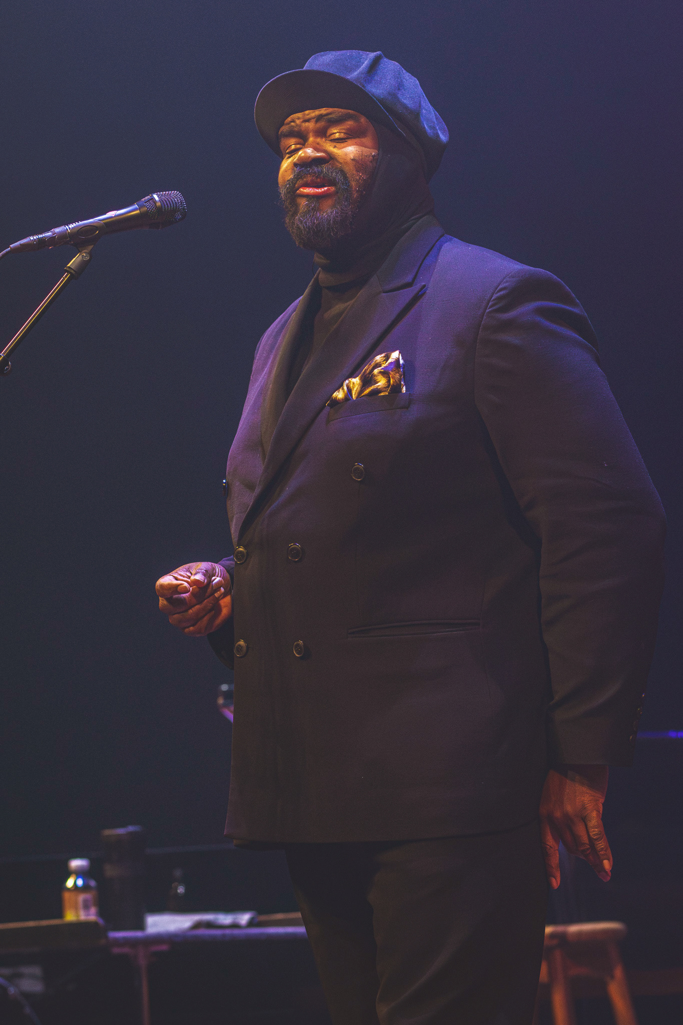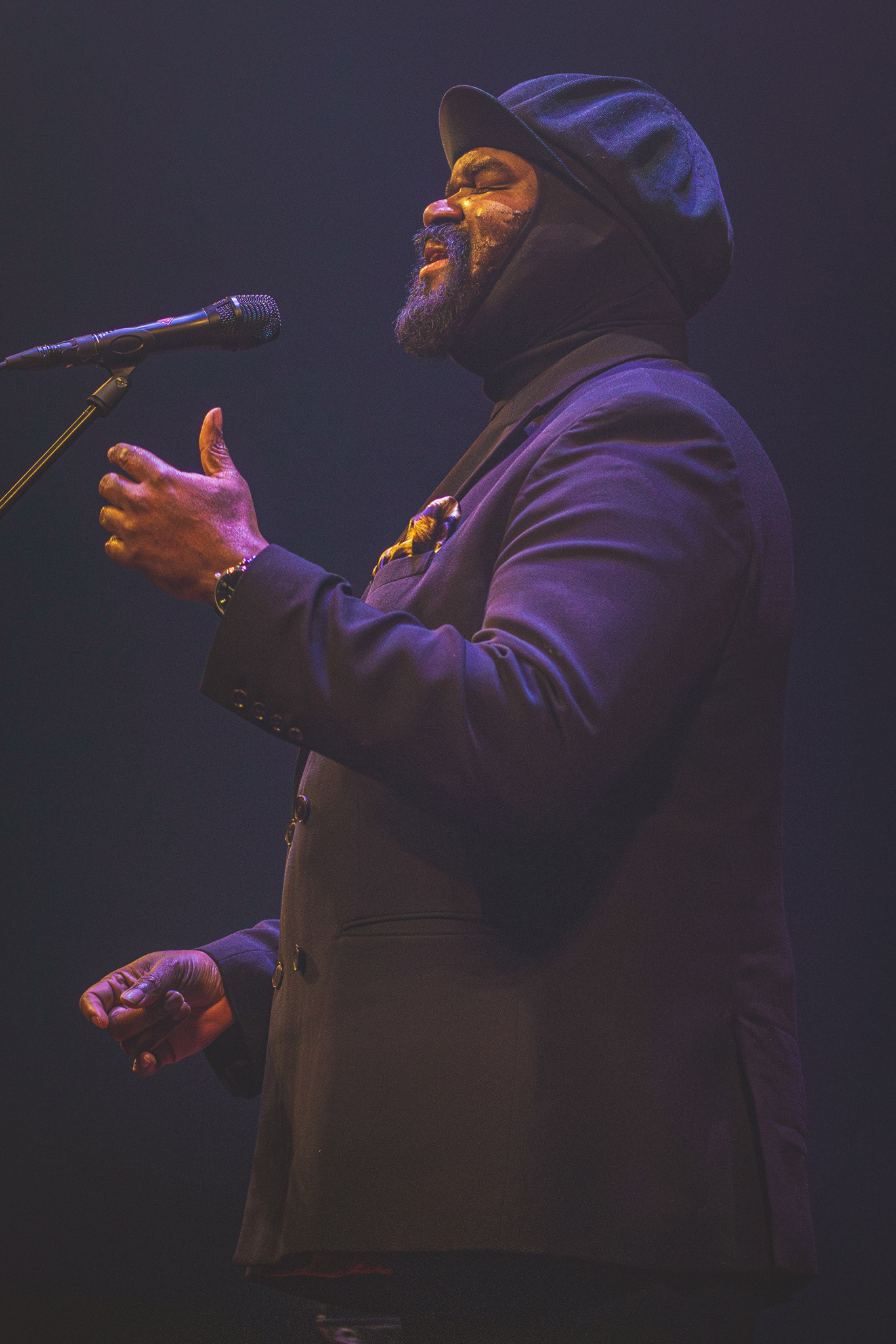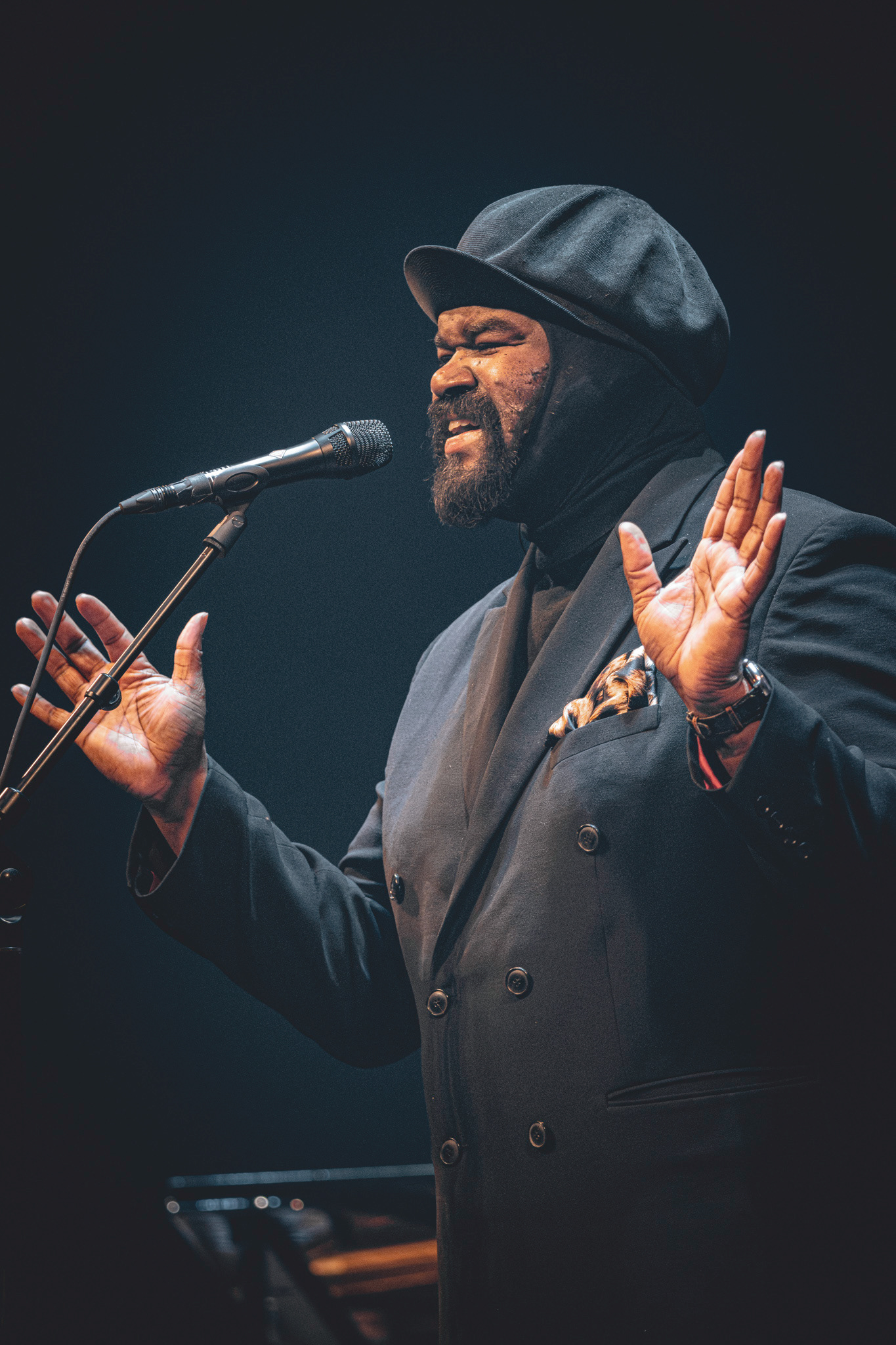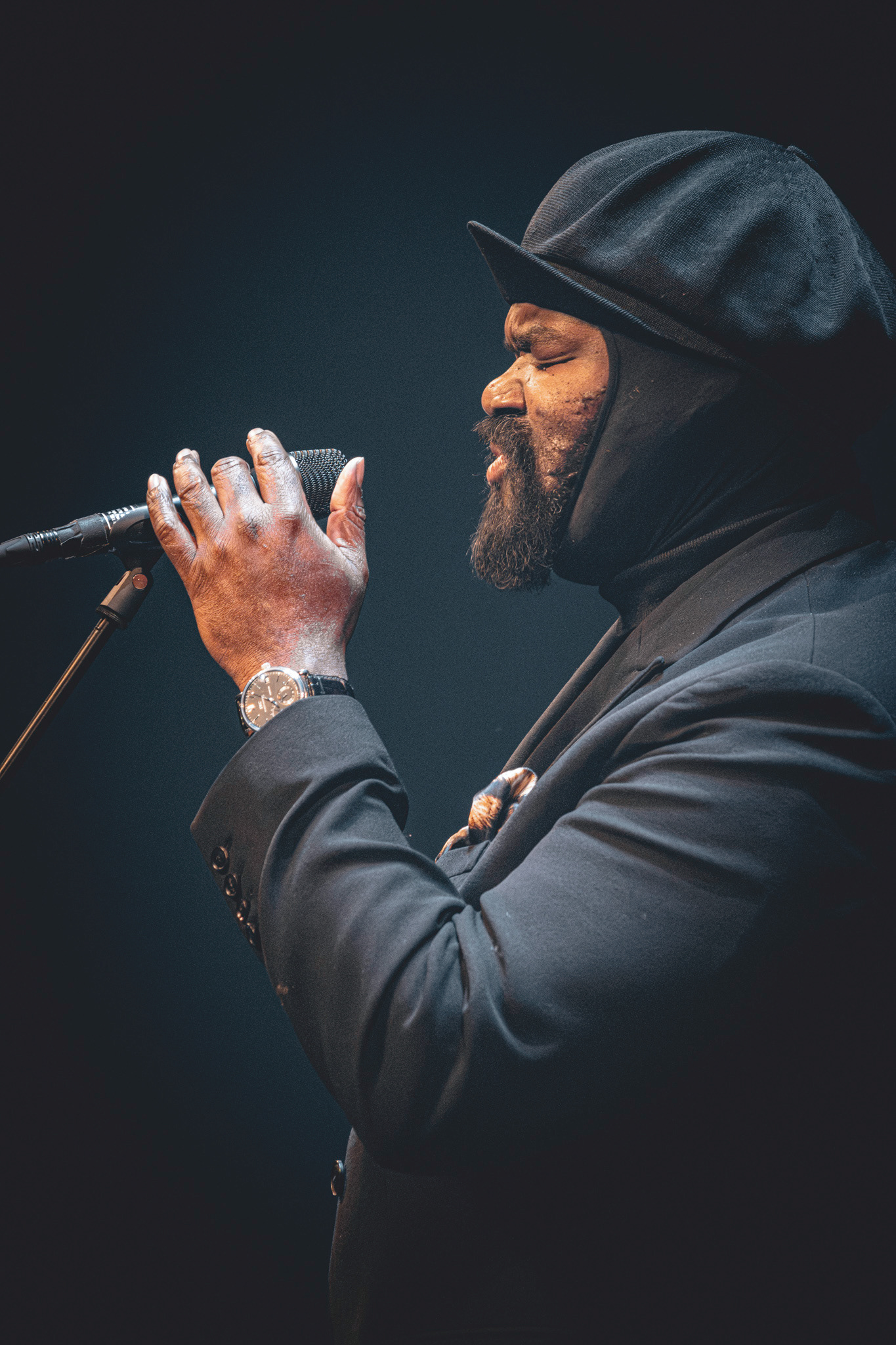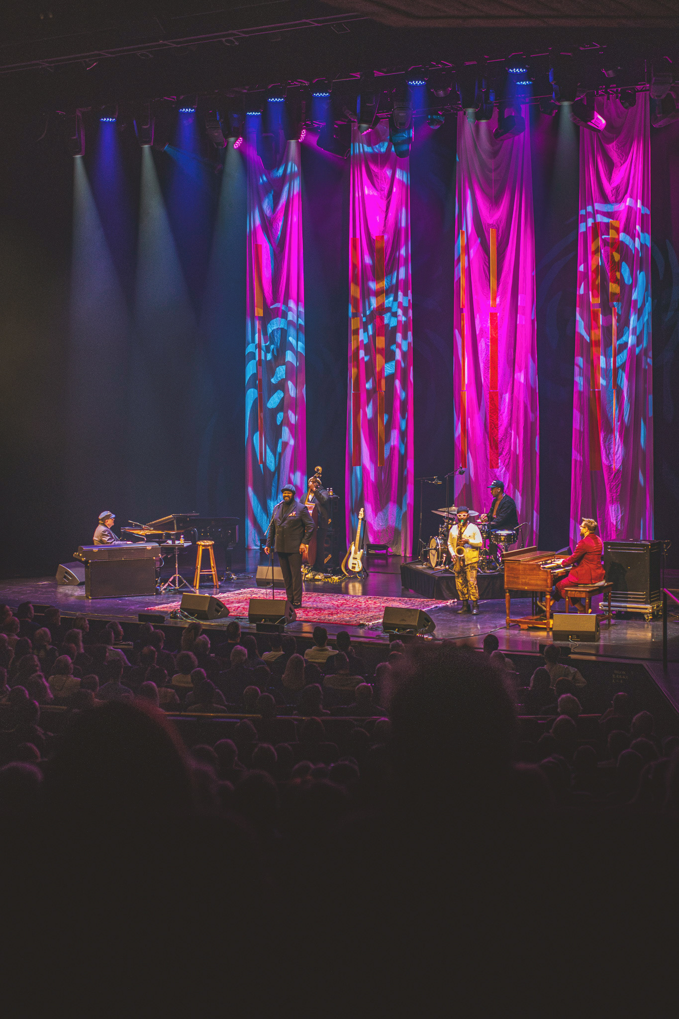 Lysdesignet var subtilt og elegant. Den mørke belysning og de varmhvide lysstråler, der fokuserede på Gregory Porter og hans band, skabte en atmosfære, hvor publikum kunne fordybe sig i musikkens magi. Lyset fremhævede det intime øjeblik, samtidig med at det understøttede den storslåede oplevelse af at være vidne til en af jazzens største stemmer i et af landets mest imponerende spillesteder.