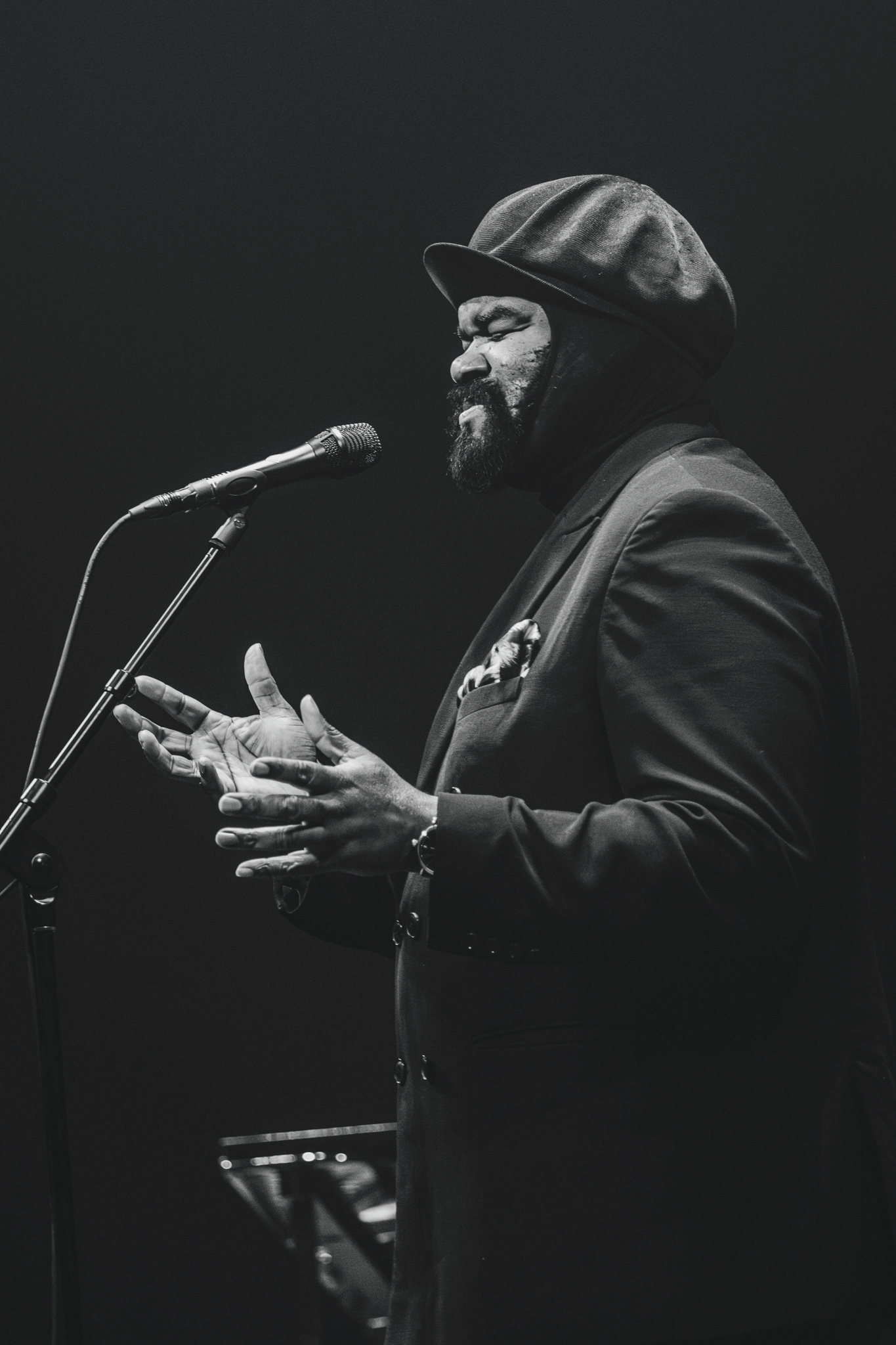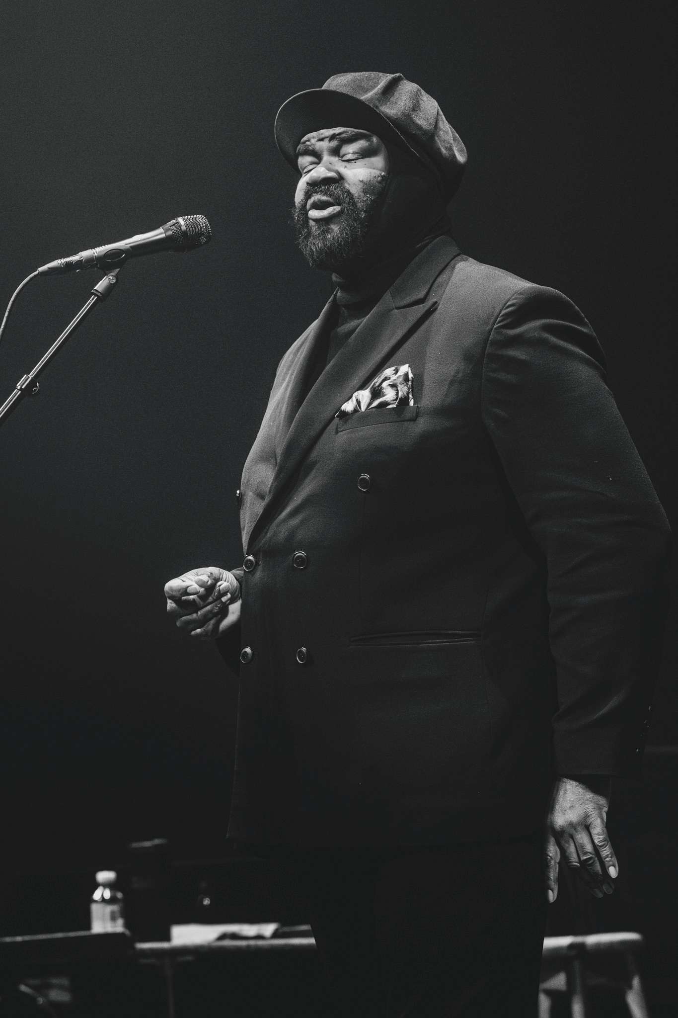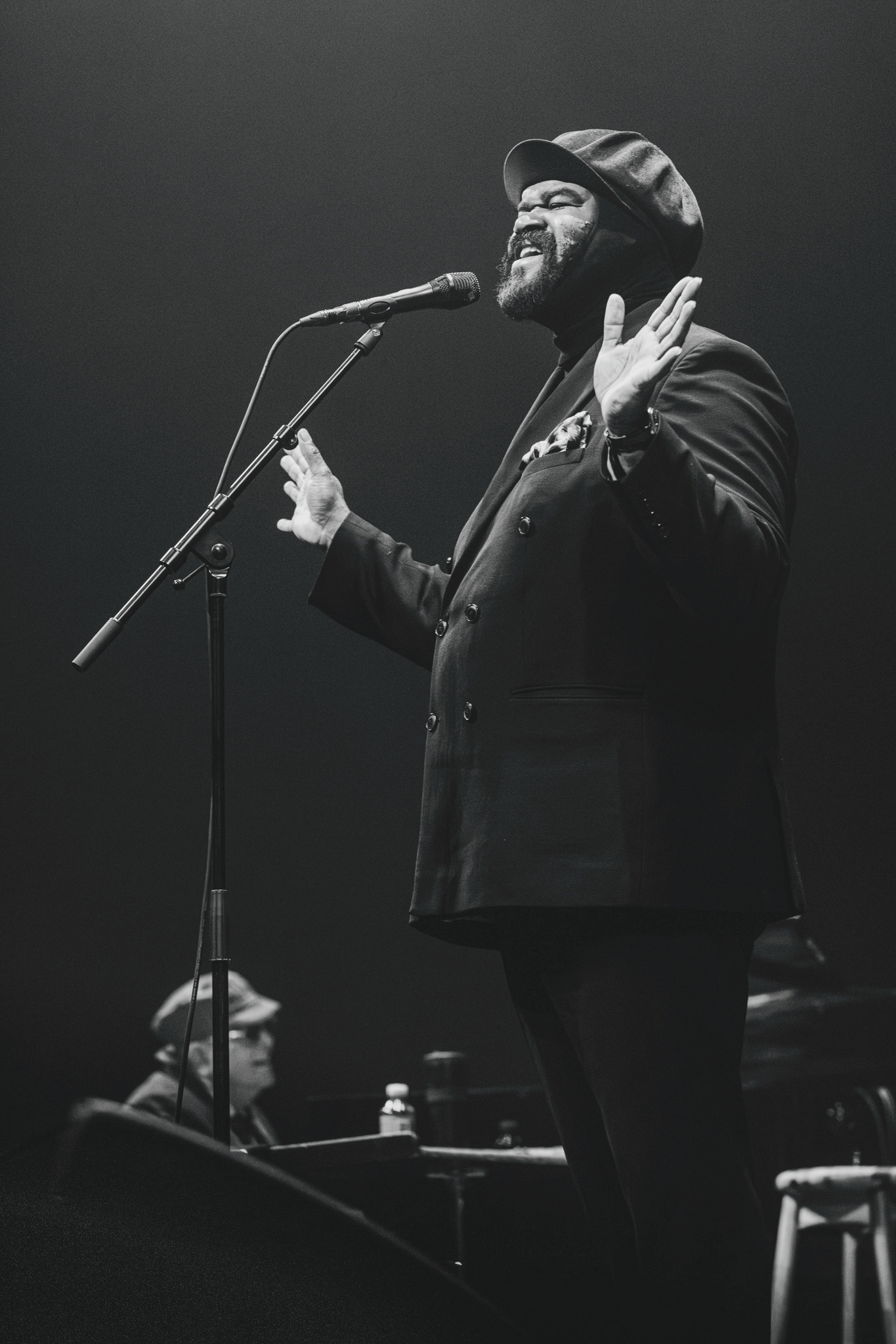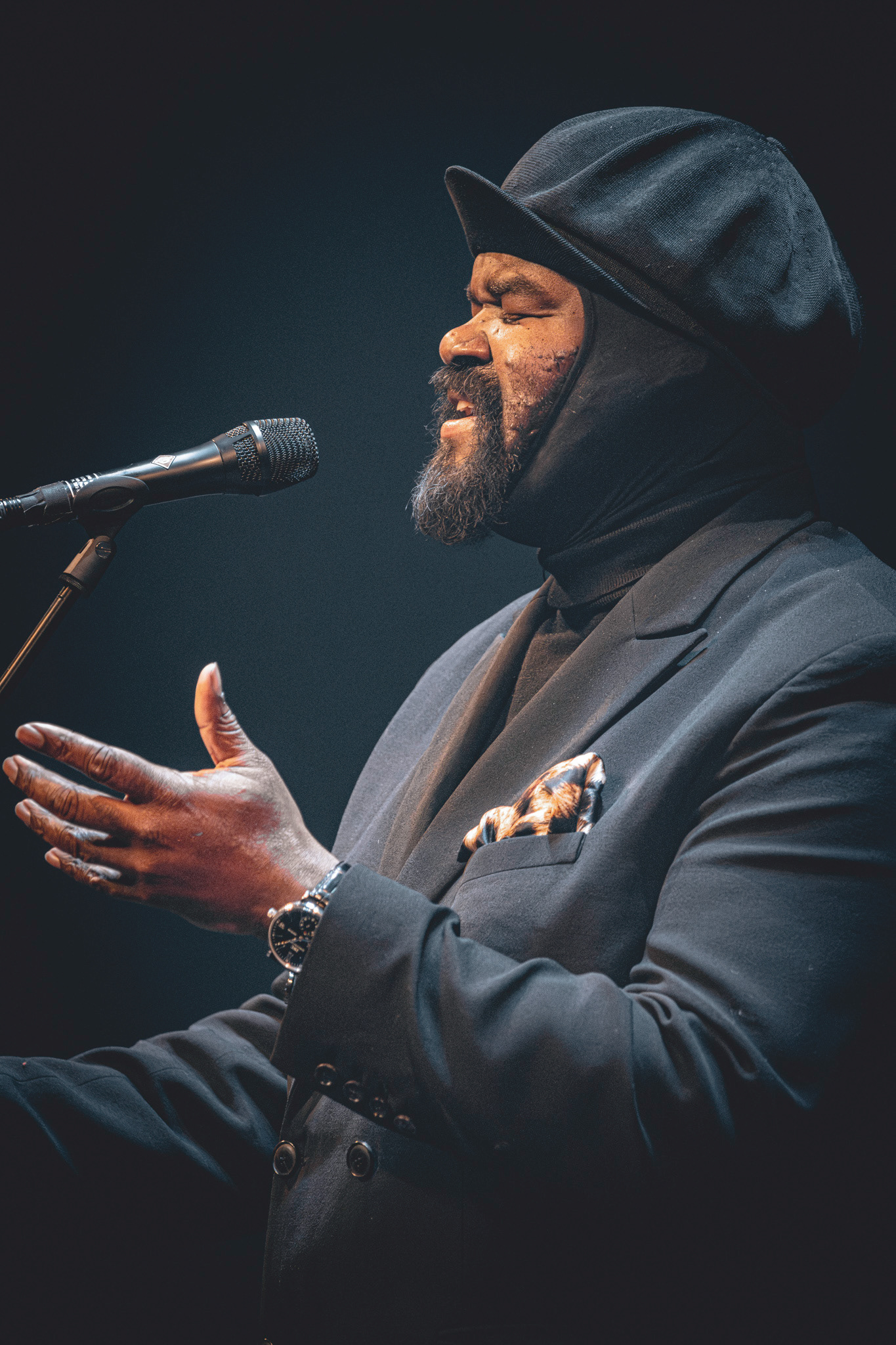 Lysdesignet var subtilt og elegant. Den mørke belysning og de varmhvide lysstråler, der fokuserede på Gregory Porter og hans band, skabte en atmosfære, hvor publikum kunne fordybe sig i musikkens magi. Lyset fremhævede det intime øjeblik, samtidig med at det understøttede den storslåede oplevelse af at være vidne til en af jazzens største stemmer i et af landets mest imponerende spillesteder.