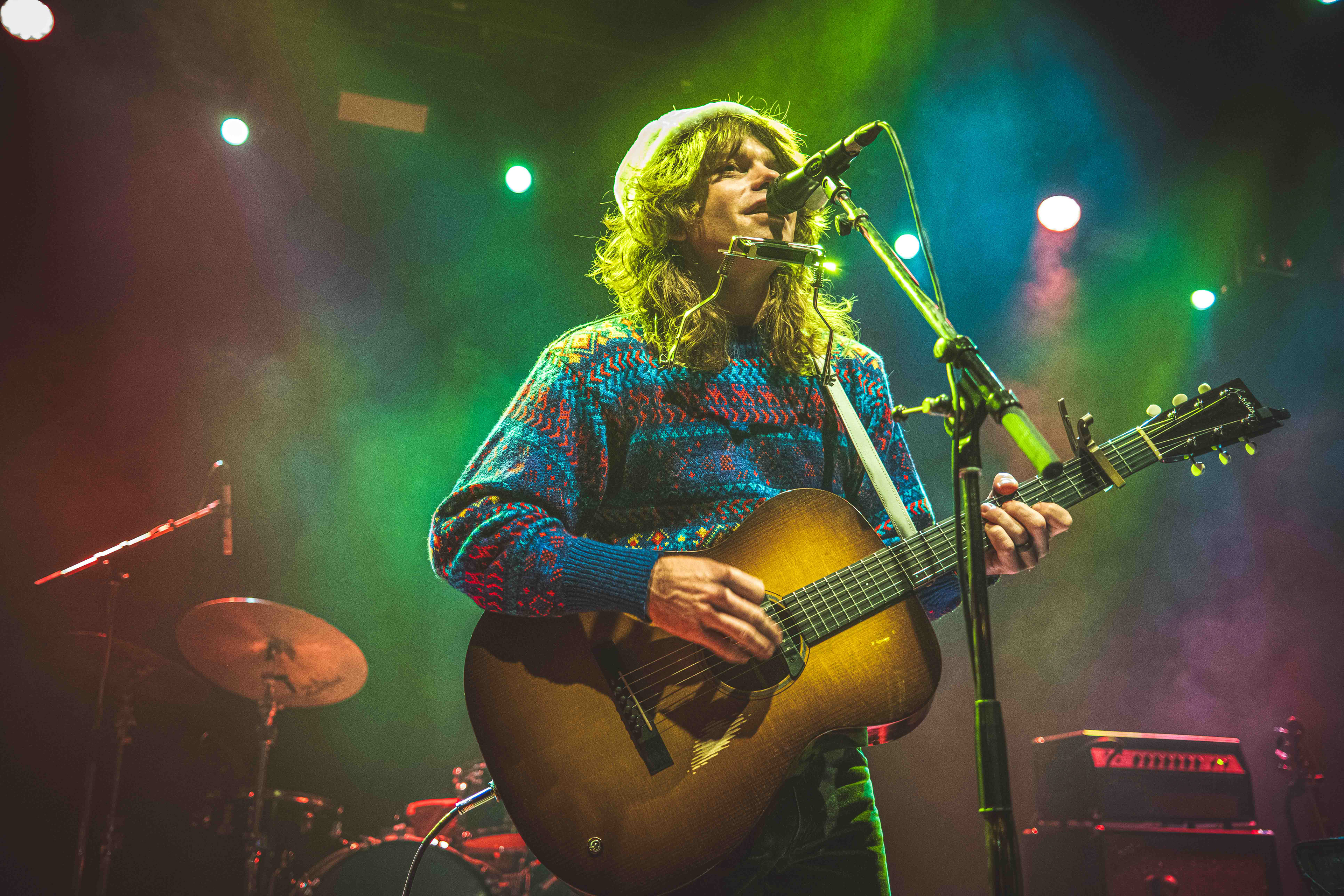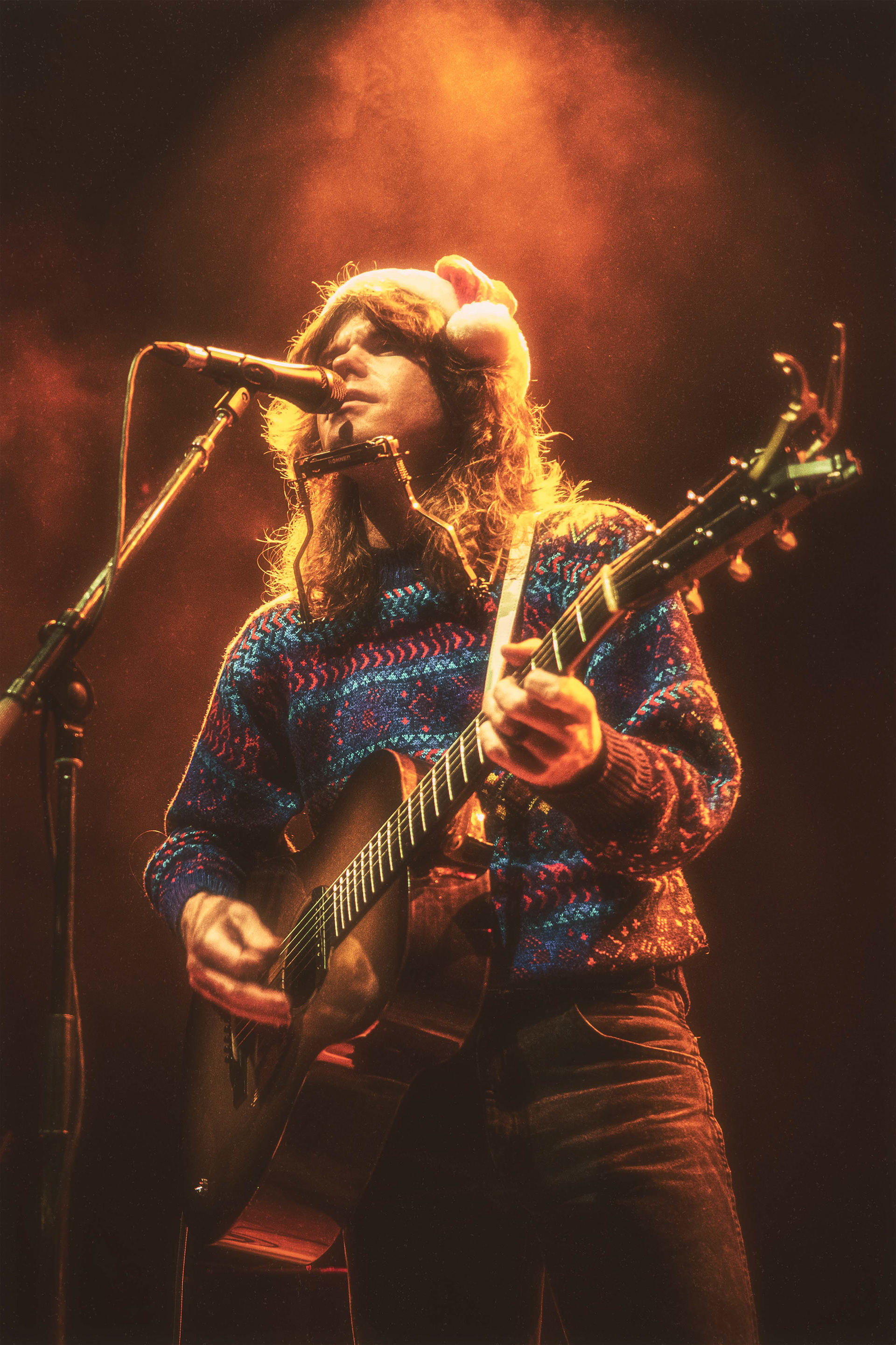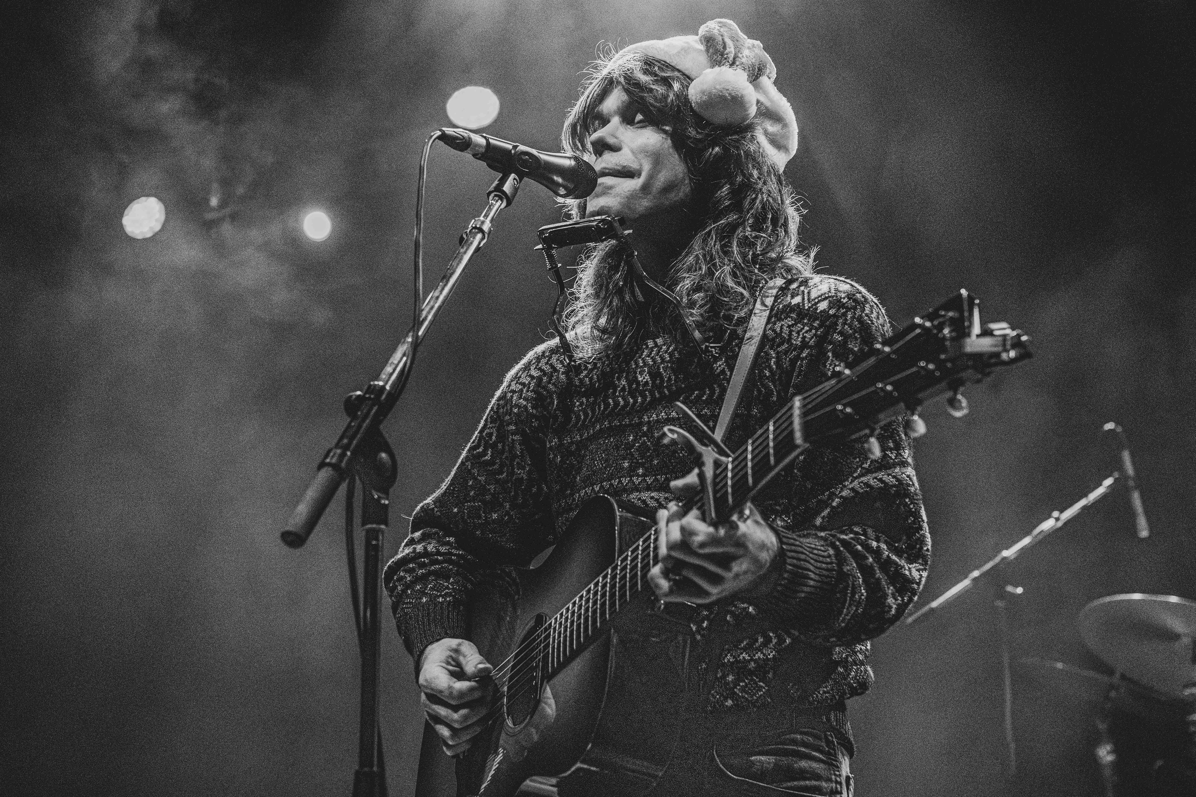 Da Jesse Welles trådte ind på scenen, var det med en nissehue solidt plantet på hovedet. Det var den 13. december, og han lagde ud med et skævt, humoristisk greb: “Kender I Den Om Rudolf?” – naturligvis sunget på engelsk. Det var både selvironisk og afvæbnende, og allerede her stod det klart, at aftenen ville balancere mellem det legende og det alvorstunge.