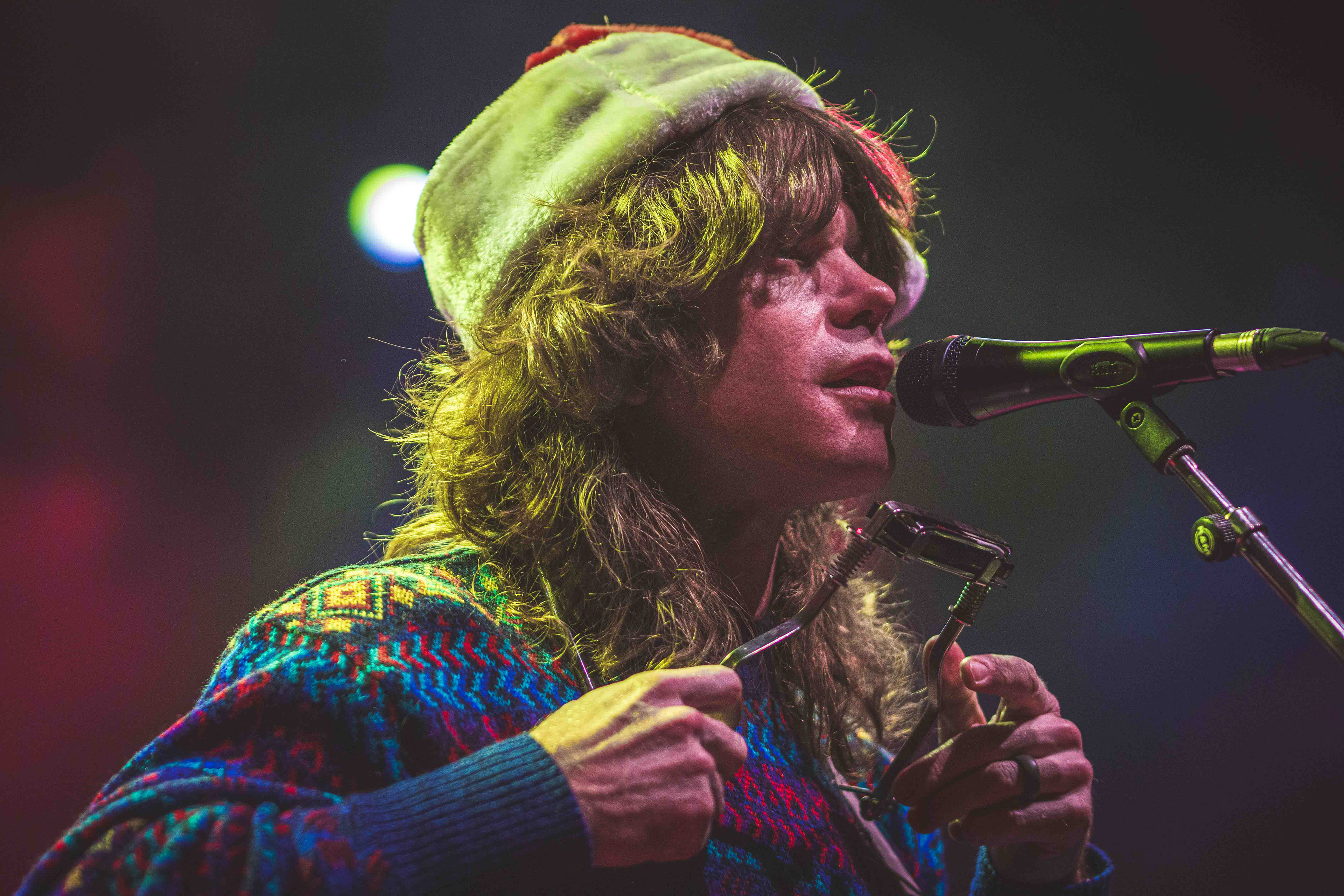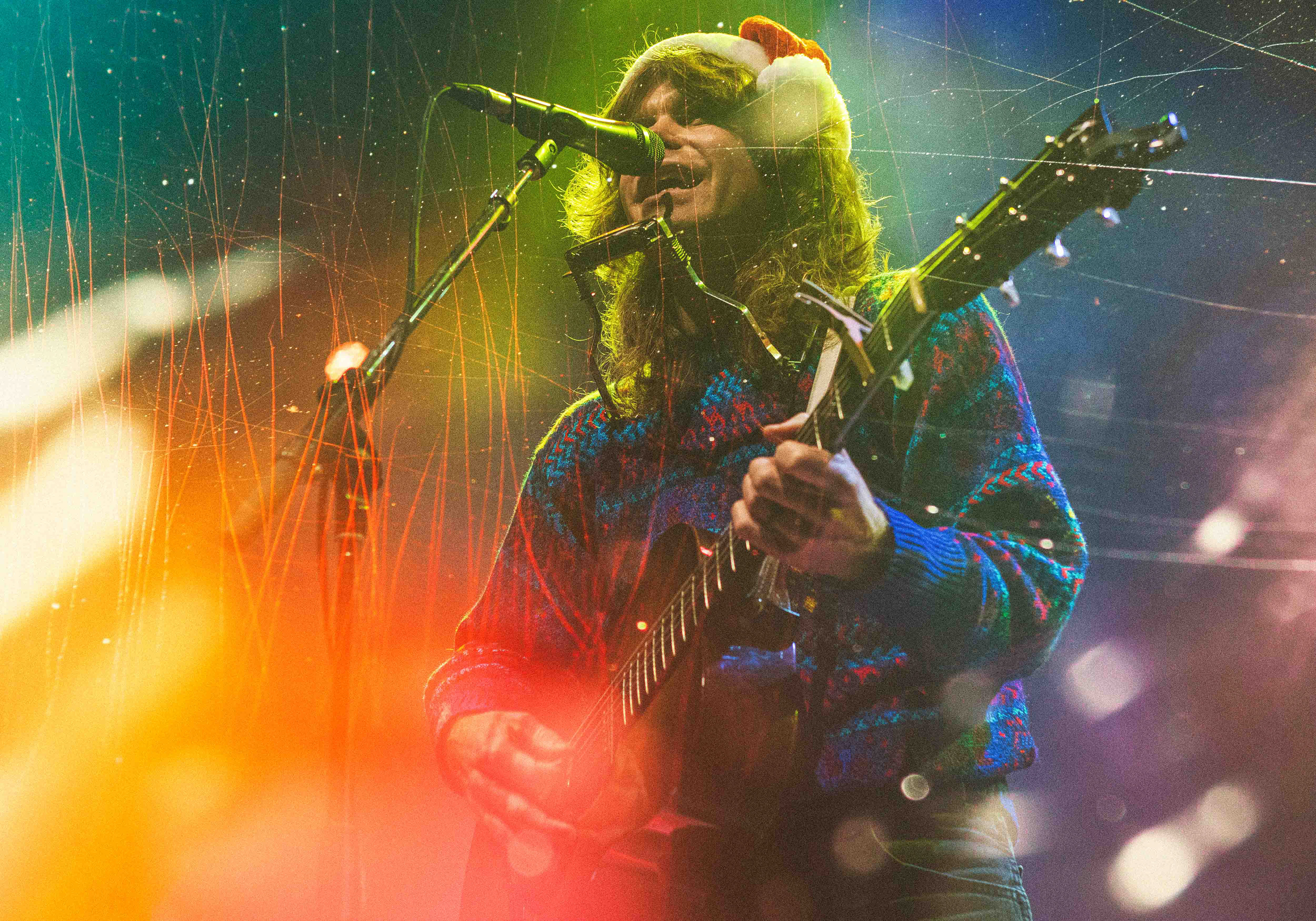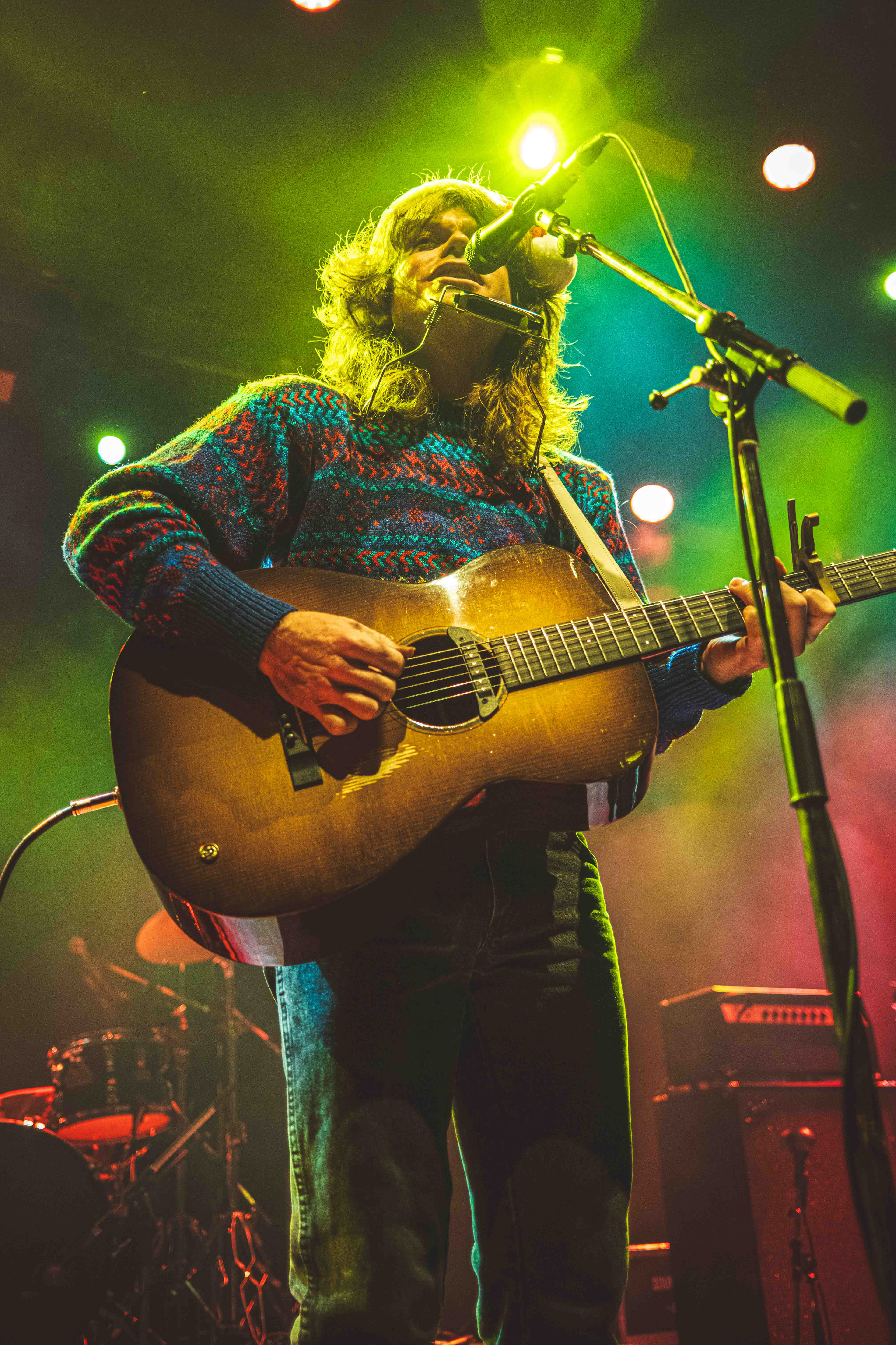 Da Jesse Welles trådte ind på scenen, var det med en nissehue solidt plantet på hovedet. Det var den 13. december, og han lagde ud med et skævt, humoristisk greb: “Kender I Den Om Rudolf?” – naturligvis sunget på engelsk. Det var både selvironisk og afvæbnende, og allerede her stod det klart, at aftenen ville balancere mellem det legende og det alvorstunge.